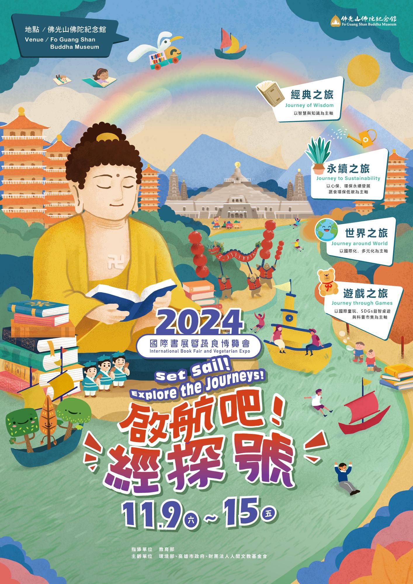 2024國際書展暨蔬食博覽會主題【啟航吧!經探號】,以尋寶形式展開知識探索之旅,讓來館民眾悠遊在佛館四大旅程,體驗經典閱讀、樂活蔬食、環境教育、藝文展演、文化交流。