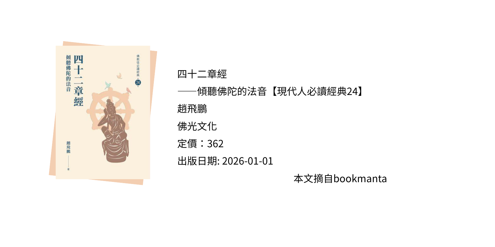 本書由臺大中文系教授、長年研修南北傳佛教的趙飛鵬教授撰寫與解讀。他不把《四十二章經》當成只能「信仰」的經文,而是嘗試帶讀者回到佛陀說話的現場——